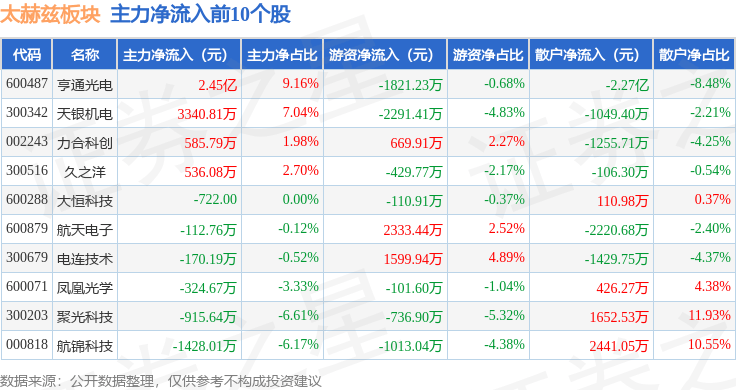 从资金流向上来看,当日太赫兹板块主力资金净流出7.26亿元,游资资金净流入1.65亿元,散户资金净流入5.61亿元。太赫兹板块个股资金流向见下表: