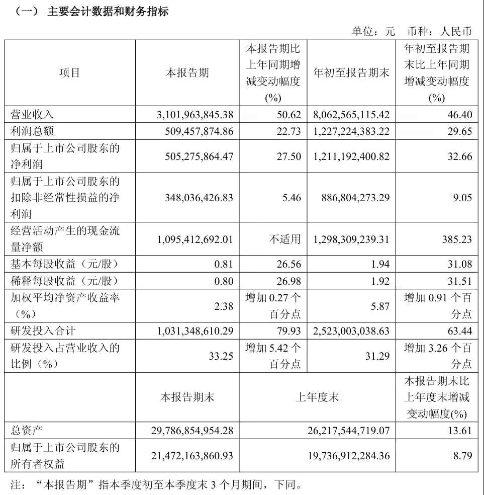 2025 年前三季度研发支出 25.23 亿元,较去年同期增长约 63.44%,研发支出占公司营业收入比例约为 31.29%。