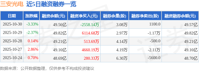 证券之星消息,截至2025年10月30日收盘,三安光电(600703)报收于13.92元,下跌3.33%,换手率1.86%,成交量92.82万手,成交额13.06亿元。