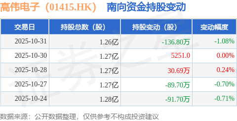 证券之星消息,10月31日南向资金减持136.8万股高伟电子(01415.HK)。近5个交易日中,获南向资金减持的有3天,累计净减持286.98万股。近20个交易日中,获南向资金减持的有13天,累计净减持907.4万股。截至目前,南向资金持有高伟电子(01415.HK)1.26亿股,占公司已发行普通股的14.45%。