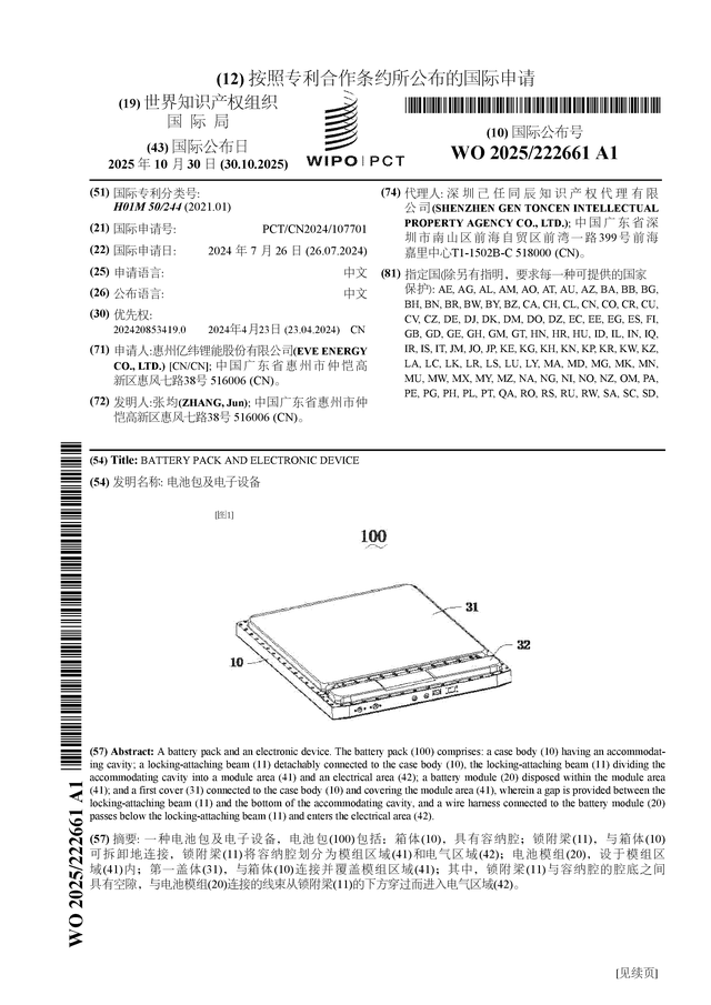 证券之星消息,根据企查查数据显示亿纬锂能(300014)公布了一项国际专利申请,专利名为“电池包及电子设备”,专利申请号为PCT/CN2024/107701,国际公布日为2025年10月30日。