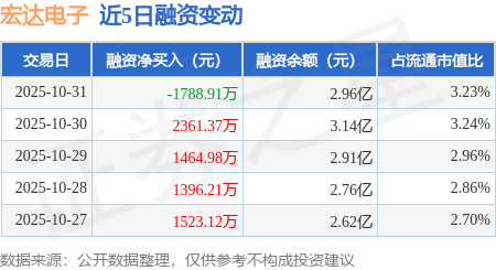 证券之星消息,10月31日,宏达电子(300726)融资买入7899.68万元,融资偿还9688.58万元,融资净卖出1788.91万元,融资余额2.96亿元,近20个交易日中有14个交易日出现融资净买入。