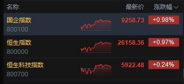 11月3日消息,港股三大指数集体上涨。截至收盘,恒生指数涨0.97%,报26158.36点,恒生科技指数涨0.24%,国企指数涨0.98%。盘面上,科网股涨多跌少,小米涨超3%,哔哩哔哩、快手、联想、网易涨超1%,阿里巴巴跌超1%;石油股走强,中海油涨超3%;航空股普涨,中国南方航空涨超4%;半导体板块跌幅居前,华虹半导体跌超3%;明略科技上市首日涨超106%。