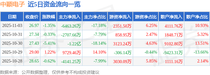证券之星消息,截至2025年11月3日收盘,中颖电子(300327)报收于26.97元,下跌1.35%,换手率4.13%,成交量14.07万手,成交额3.76亿元。