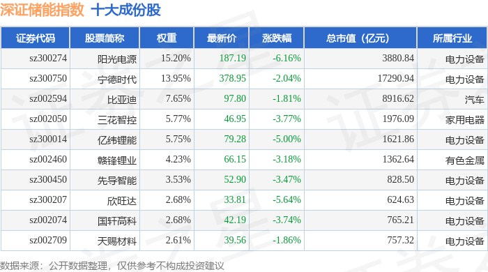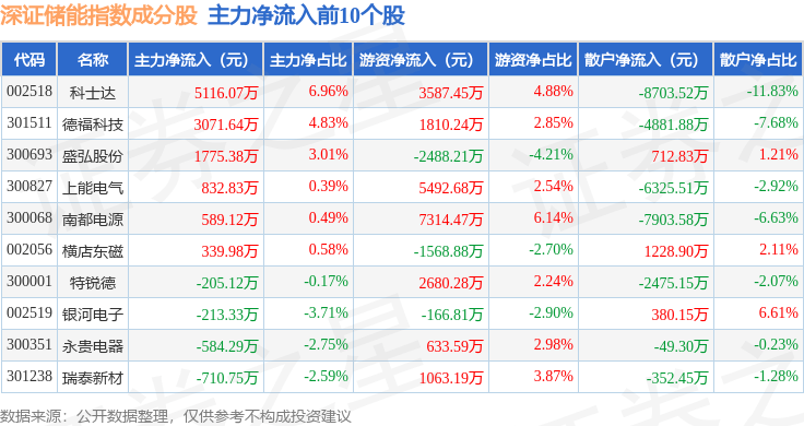 资金流向方面,深证储能(970036)指数成份股当日主力资金净流出合计117.77亿元,游资资金净流入合计25.55亿元,散户资金净流入合计92.22亿元。成份股资金流向详情见下表: