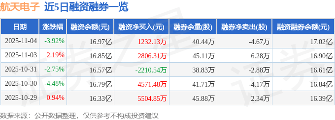 航天电子融资融券信息显示,融资方面,当日融资买入8894.66万元,融资偿还7662.54万元,融资净买入1232.13万元。融券方面,融券卖出8100.0股,融券偿还5.48万股,融券余量40.44万股,融券余额435.94万元。融资融券余额17.02亿元。