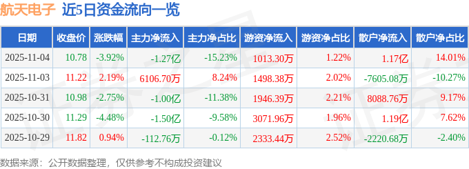 证券之星消息,截至2025年11月4日收盘,航天电子(600879)报收于10.78元,下跌3.92%,换手率2.31%,成交量76.37万手,成交额8.32亿元。