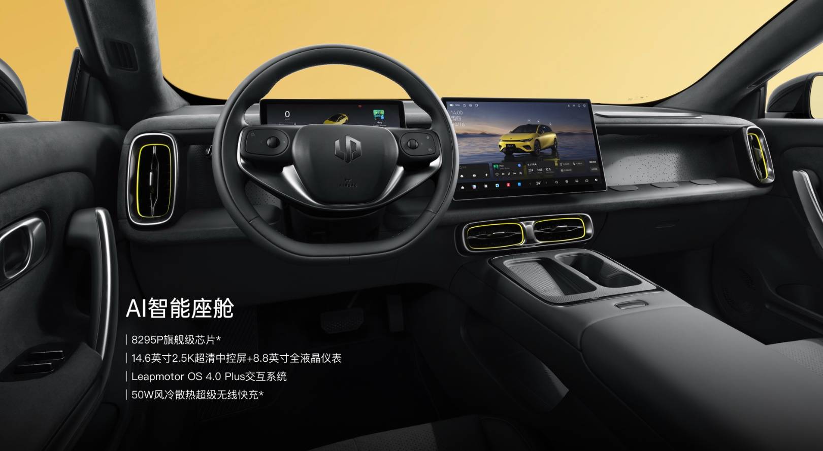 内饰方面,零跑Lafa 5采用了较为简约的设计风格,同时新车提供速域紫、驰影灰,以及高配车型的竞速灰内饰配色。此外,零跑Lafa 5座椅还采用了真皮+仿麂皮超纤绒材质,并压印赛道纹理与Lafa5专属字体。配置方面,新车配置了8.8英寸全液晶仪表、14.6英寸中控屏内置8295芯片。此外,新车还配备了自动空调、语音识别控制、50W手机无线充电等功能。