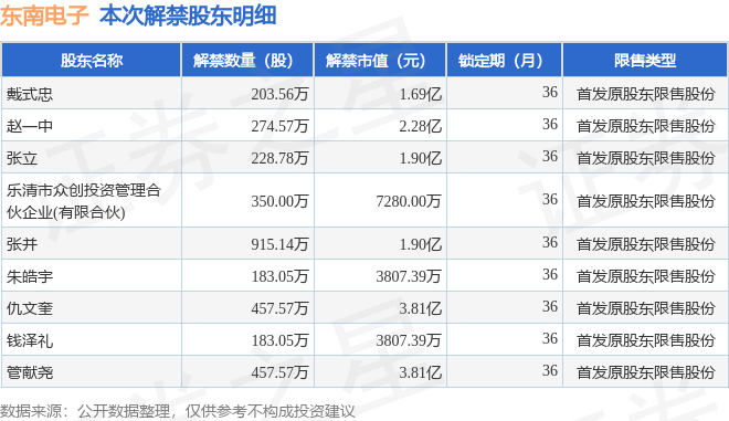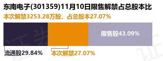 证券之星消息,根据市场公开信息整理,东南电子(301359)于11月10日将有3253.28万股限售股份解禁,为公司首发原股东限售股份,占公司总股本27.07%。(本次数据根据历史公告整理得出,实际情况以上市公司最新公告为准)本次解禁后,公司还有5177.93万股限售股份,占总股本43.09%。具体如下图所示:
