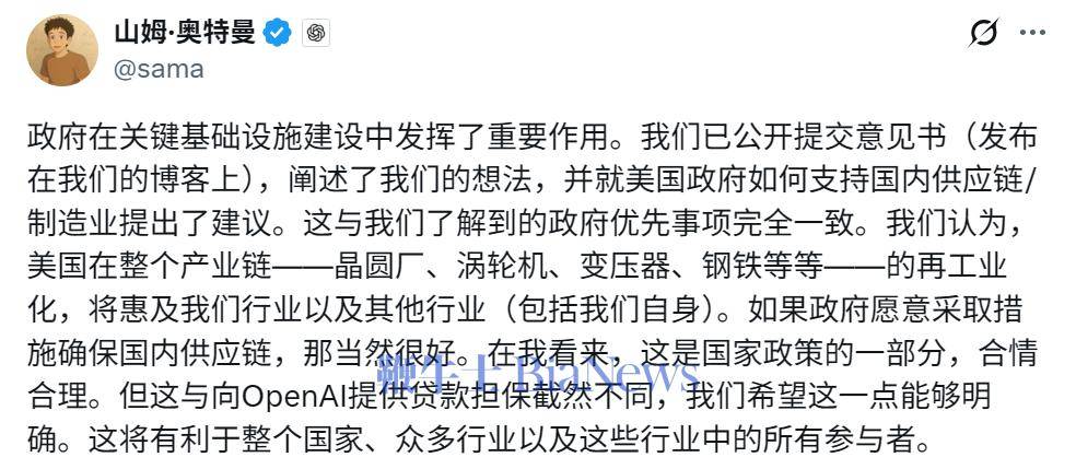 公司首席执行官萨姆·奥特曼近日在社交媒体平台X上发文,呼吁联邦政府扩大《芯片法案》(CHIPS Act)税收抵免的适用范围,认为美国应加快在制造业、能源和科技基础设施上的再工业化步伐。