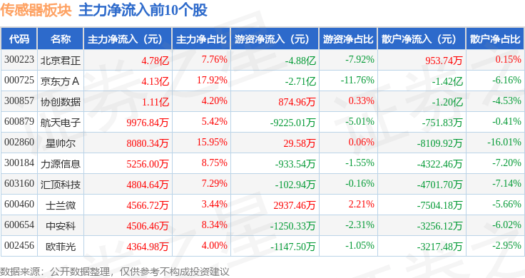 从资金流向上来看,当日传感器板块主力资金净流出26.65亿元,游资资金净流入6351.25万元,散户资金净流入26.02亿元。传感器板块个股资金流向见下表:
