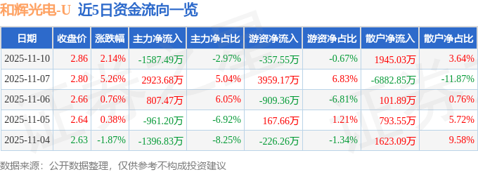 证券之星消息,截至2025年11月10日收盘,和辉光电(688538)报收于2.86元,上涨2.14%,换手率3.23%,成交量185.91万手,成交额5.35亿元。