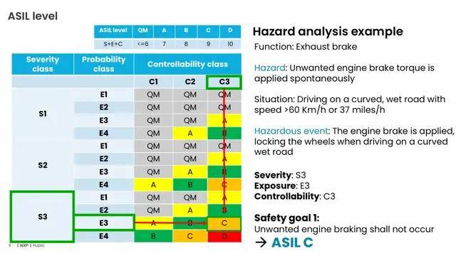 例如排气制动功能,若出现非预期发动机制动导致湿滑弯道车轮锁死,其严重性为S3、暴露概率E3、可控性C3,对应ASIL C等级。