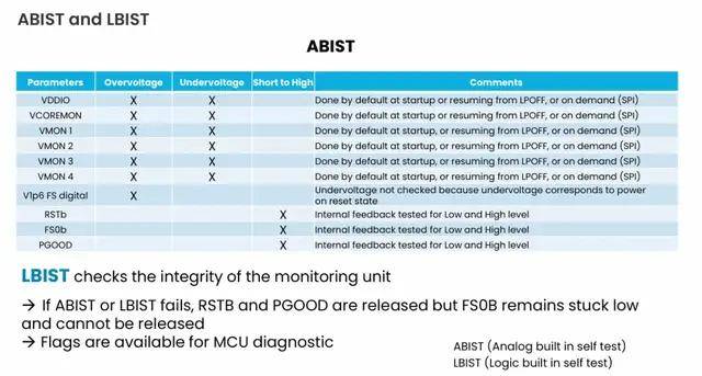 自测机制(ABIST/LBIST):ABIST(模拟内置测试)默认在PMIC启动时、从低功耗模式(LPOFF)唤醒时自动触发,也可通过 SPI接口按需触发;LBIST(逻辑内置测试)检测监控单元的逻辑电路完整性,覆盖组合逻辑与时序逻辑故障。