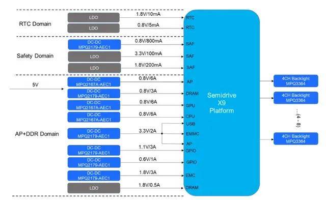 MPS主要通过与车规MCU、SoC厂商联合开发定制化汽车PMIC解决方案。比如此前与芯驰合作的X9H参考板,采用两级供电架构:一级电路采用MPQ4436-AEC1,支持45V宽输入、6A输出,可选展频功能降低EMI;二级电路采用MPQ217x系列与MPQ2167A-AEC1搭配,实现快速瞬态响应、超低噪声输出,适配多屏联动需求。