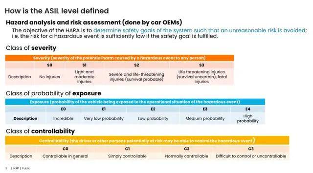 谈及功能安全,其安全等级的确定与系统安全目标紧密相关,需基于具体的系统风险分析来明确。因此,OEM会遵循ISO 26262标准,通过危害分析与风险评估(HARA) 确定ASIL等级。该等级由严重度(Severity)、曝光度(Exposure)、可控度(Controllability) 三个维度进行评估: