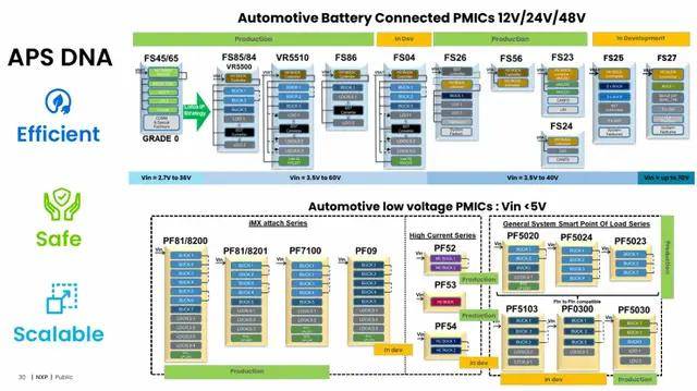 恩智浦(NXP)构建了覆盖高、中、低压场景的汽车PMIC产品矩阵,适配从传统燃油车到高端智能电动车的需求。同时,恩智浦PMIC构建了跨厂商处理器适配生态,在ADAS、动力域、智能座舱等领域支持Ambarella、地平线、英飞凌等品牌处理器提供适配方案。