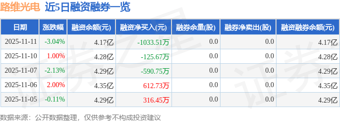 路维光电融资融券信息显示,融资方面,当日融资买入2098.96万元,融资偿还3132.47万元,融资净偿还1033.51万元。融券方面,融券卖出0.0股,融券偿还0.0股,融券余量0.0股,融券余额0.0万元。融资融券余额4.17亿元。