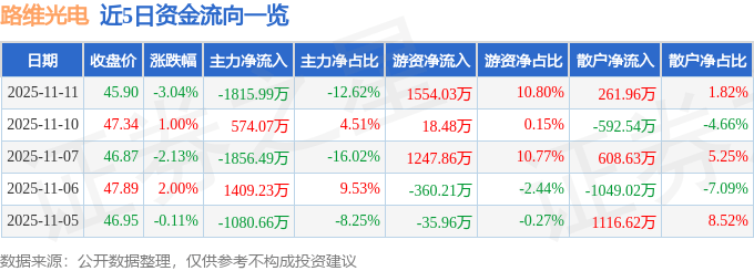 证券之星消息,截至2025年11月11日收盘,路维光电(688401)报收于45.9元,下跌3.04%,换手率1.59%,成交量3.08万手,成交额1.44亿元。