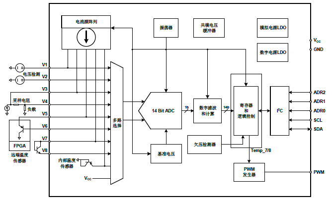 该监视器一款用于监视PCB系统温度、电压和电流的产品。芯片通过IIC串行接口,8个监视器可单独地测量8路外部单端电压,也可以配对以进行4路差分电压、电流或远端BJT的温度测量,同时也可以测量内部温度以及电源电压VCC。器件通过内置的10ppm/°C基准最大限度地缩减了所需的支持原件数目以及占板面积。可选的PC地址与功能配置使得芯片可以灵活应用于各种需要测量温度、电压或电流数据的系统。器件支持与V7、V8连接的BJT的温度成比例的PWM输出,用于控制风扇或加热器。