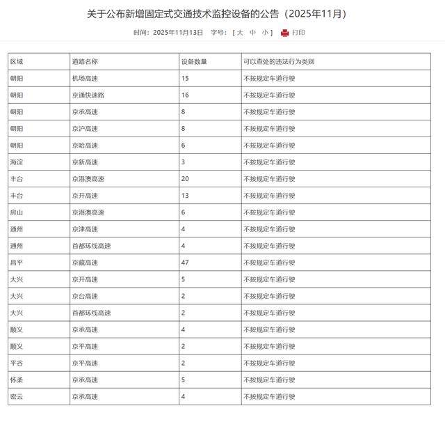 11月13日,北京市公安局公安交通管理局网站发布《关于公布新增固定式交通技术监控设备的公告(2025年11月)》,详情如下: