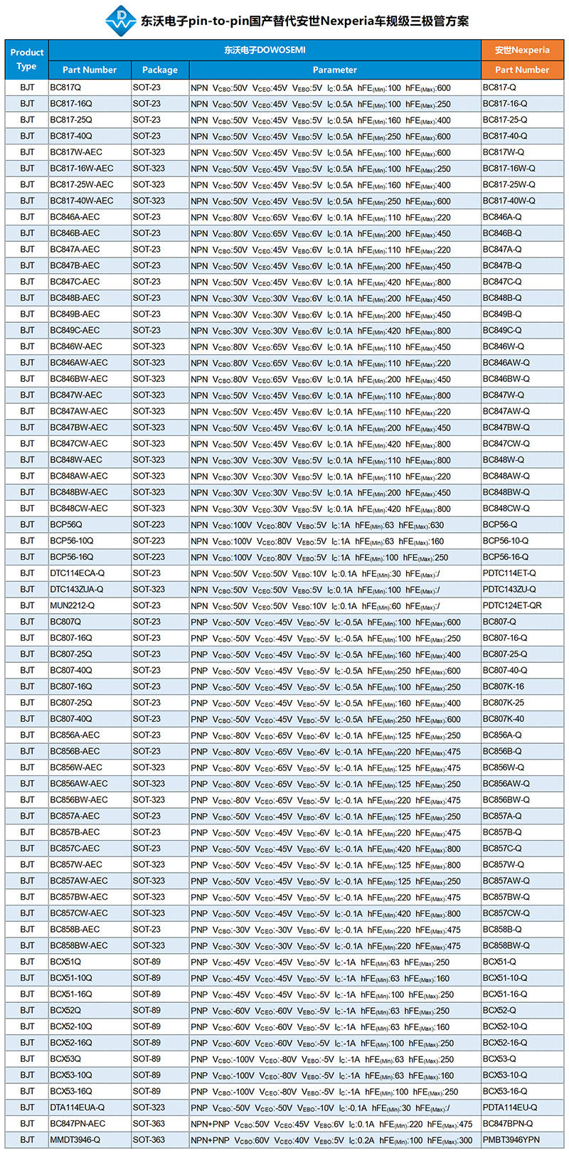 1)一键替换,无需改板:东沃车规级三极管与安世车规级三极管对应型号在封装、引脚和电性参数上完全兼容。客户无需修改PCB布局或调整电路设计,即可实现“即换即用”,极大缩短了产品重新验证周期,加速上市时间。全系列Pin-to-Pin设计,直接替代,工程零负担。