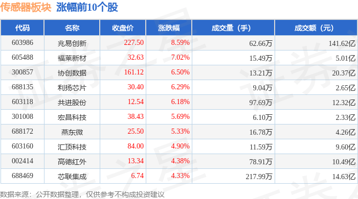 证券之星消息,11月13日传感器板块较上一交易日上涨1.7%,兆易创新领涨。当日上证指数报收于4029.5,上涨0.73%。深证成指报收于13476.52,上涨1.78%。传感器板块个股涨跌见下表: