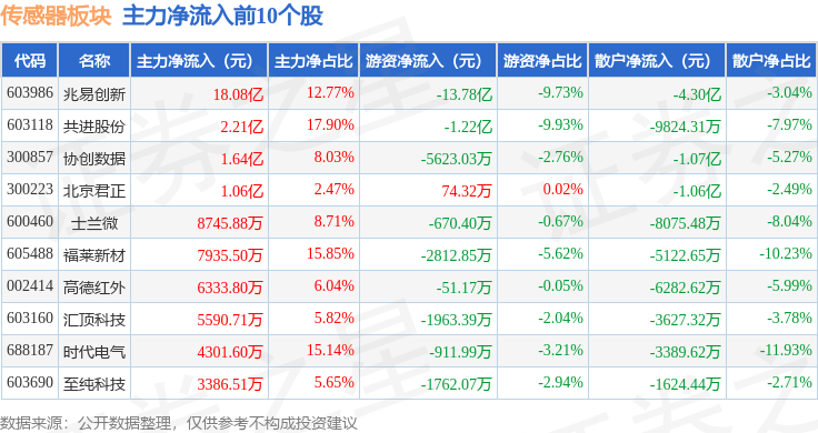 从资金流向上来看,当日传感器板块主力资金净流入17.96亿元,游资资金净流出14.41亿元,散户资金净流出3.54亿元。传感器板块个股资金流向见下表: