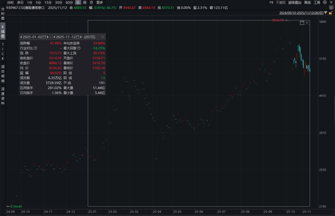 而年末的收官战,全球市场大概率还是以AI科技做主线,美股的AI调整是良性的,有对泡沫的争论声,反而代表了市场对泡沫的谨慎程度,所以还没有到泡沫阶段。对港股来说,本身投入还没有美股那么大,也称不上有泡沫可言,反倒是AI的出现让不少公司的逻辑切换为3-5年的成长期,港股市场还是有一定的AI投资机会。