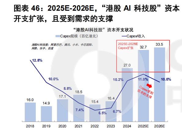 根据市场预期,“港股 AI 科技股”资本开支占收入比例有望从 2025 年的 11.0% 下降至 2026 年的 10.0%,能够得到需求的支撑,AI 业务表现亮眼。