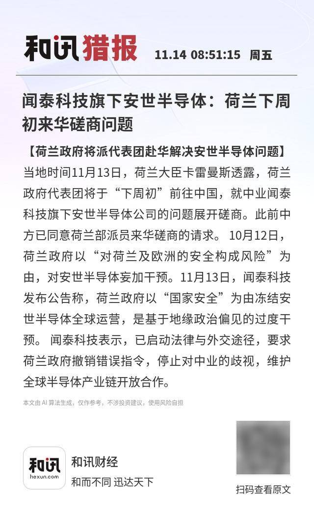 【荷兰政府将派代表团赴华解决安世半导体问题】当地时间11月13日,荷兰大臣卡雷曼斯透露,荷兰政府代表团将于“下周初”前往中国,就中业闻泰科技旗下安世半导体公司的问题展开磋商。此前中方已同意荷兰部派员来华磋商的请求。 10月12日,荷兰政府以“对荷兰及欧洲的安全构成风险”为由,对安世半导体妄加干预。11月13日,闻泰科技发布公告称,荷兰政府以“国家安全”为由冻结安世半导体全球运营,是基于地缘政治偏见的过度干预。 闻泰科技表示,已启动法律与外交途径,要求荷兰政府撤销错误指令,停止对中业的歧视,维护全球半导体产业链开放合作。