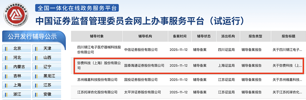 芯东西11月14日报道,11月13日,证监会官网披露,上海半导体自动物料搬运系统(AMHS)及核心零部件供应商弥费科技在上海证监局办理辅导备案登记,启动IPO进程,辅导机构为国泰海通。