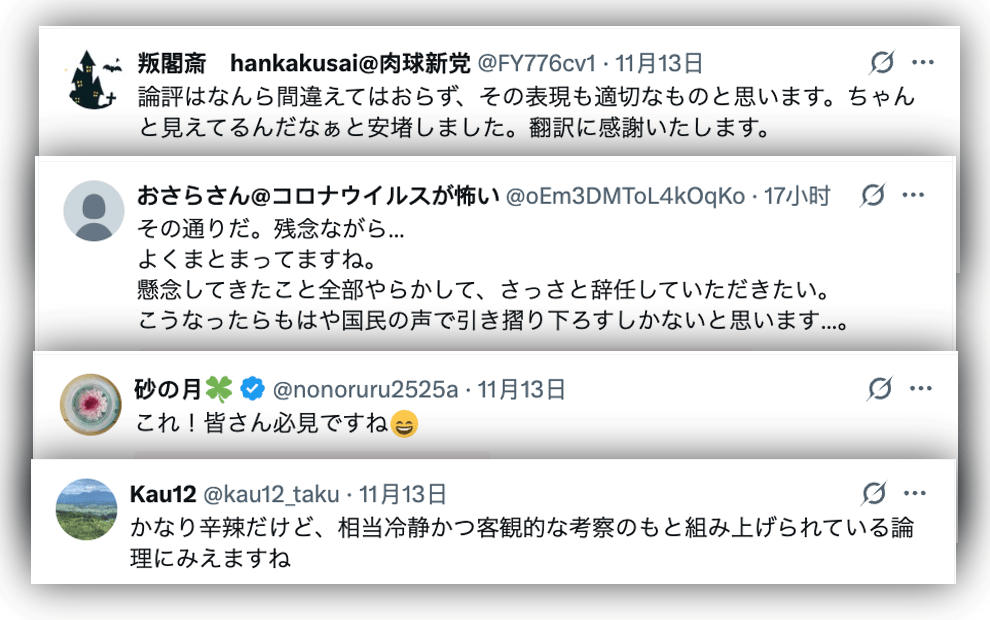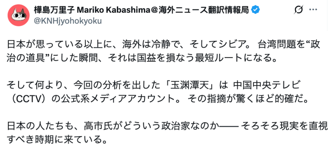 这些声音来自日语、英语、韩语等多个语言社群,且论述角度高度一致,高市早苗不是“强硬”,而是“投机”;不是“护国”,而是“利用台湾问题换政治资本”。