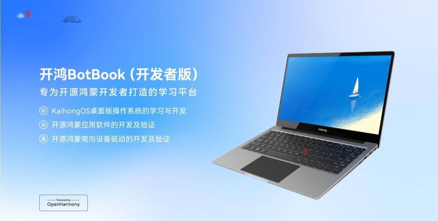 另外,深开鸿 KaihongOS 还是首个基于开源鸿蒙的桌面操作系统。在今年 5 月,深开鸿发布了开鸿 BotBook 笔记本、BotMini 主机产品,搭载瑞芯微 RK3588 处理器 + 14 英寸 1080P IPS 屏 + 6000mAh 电池、预装基于开源鸿蒙的 KaihongOS 桌面版系统,支持一拖即连、拖拽即合新交互。