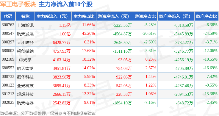从资金流向上来看,当日军工电子板块主力资金净流入5.05亿元,游资资金净流出5904.78万元,散户资金净流出4.46亿元。军工电子板块个股资金流向见下表: