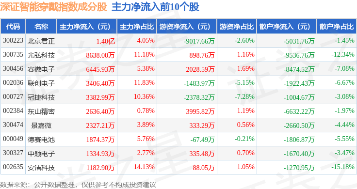 资金流向方面,深证智能穿戴(970074)指数成份股当日主力资金净流出合计24.3亿元,游资资金净流入合计7.16亿元,散户资金净流入合计17.14亿元。成份股资金流向详情见下表: