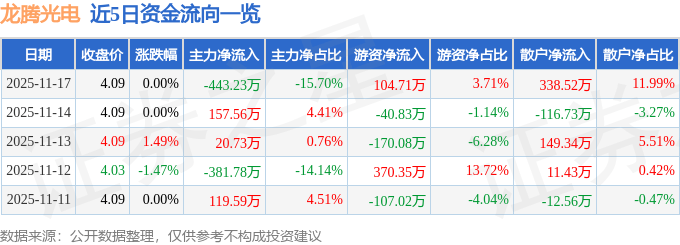 证券之星消息,截至2025年11月17日收盘,龙腾光电(688055)报收于4.09元,上涨0.0%,换手率0.21%,成交量6.94万手,成交额2823.39万元。