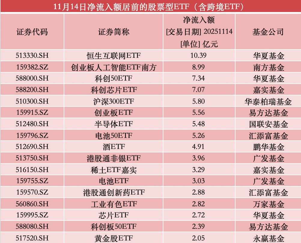 具体来看,华夏恒生互联网ETF以10.39亿元的净流入额位居榜首,南方创业板人工智能ETF、嘉实上证科创板芯片ETF上周五的净流入额也均超7亿元,分别为8.99亿元、7.07亿元。