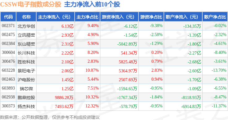 资金流向方面,CSSW电子(399811)指数成份股当日主力资金净流出合计2289.63万元,游资资金净流出合计3.11亿元,散户资金净流入合计3.34亿元。成份股资金流向详情见下表: