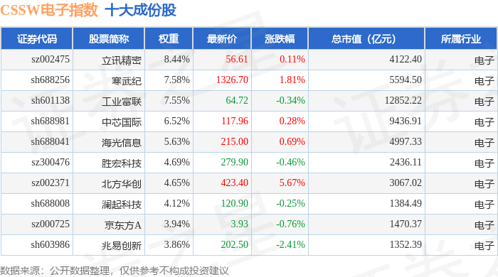 CSSW电子(399811)指数十大成份股详情如下: