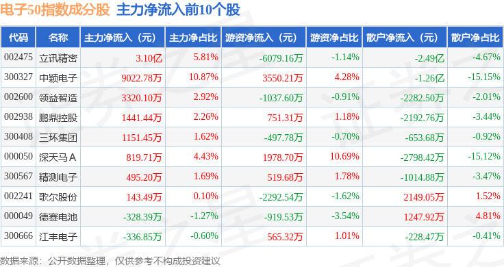 资金流向方面,电子50(399281)指数成份股当日主力资金净流出合计16.84亿元,游资资金净流入合计2.71亿元,散户资金净流入合计14.13亿元。成份股资金流向详情见下表: