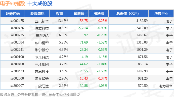 证券之星消息,11月19日,电子50(399281)指数报收于4254.11点,跌0.96%,成交413.76亿元,换手率1.58%。当日该指数成份股中,上涨的有3家,中颖电子以2.96%的涨幅领涨,下跌的有47家,盈趣科技以3.28%的跌幅领跌。