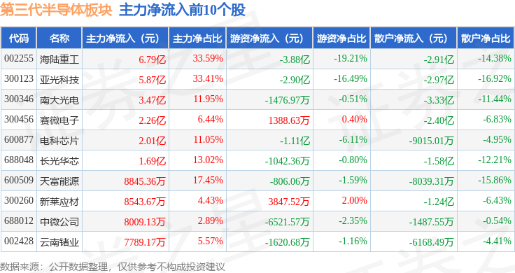从资金流向上来看,当日第三代半导体板块主力资金净流出15.35亿元,游资资金净流出1.34亿元,散户资金净流入16.68亿元。第三代半导体板块个股资金流向见下表: