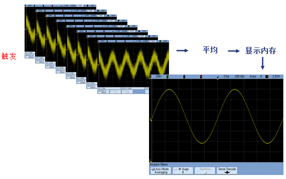 3) 平均模式 如果信号是周期性的或是直流信号,您可以使用平均模式来降低示波器的垂直噪声。平均模式会多次采集周期性波形,并生成运行平均值以降低随机噪声。高分辨率模式会降低信号的采样率和带宽,而正常平均模式却不会。但平均模式会减缓波形更新速率,因为它要进行多次采集来计算波形的平均值,然后才能在屏幕上画出轨迹。