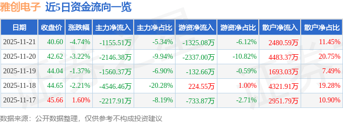 证券之星消息,截至2025年11月21日收盘,雅创电子(301099)报收于40.6元,下跌4.74%,换手率5.87%,成交量5.27万手,成交额2.17亿元。