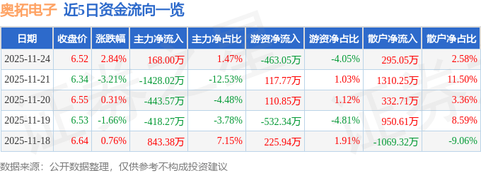证券之星消息,截至2025年11月24日收盘,奥拓电子(002587)报收于6.52元,上涨2.84%,换手率3.36%,成交量17.71万手,成交额1.14亿元。