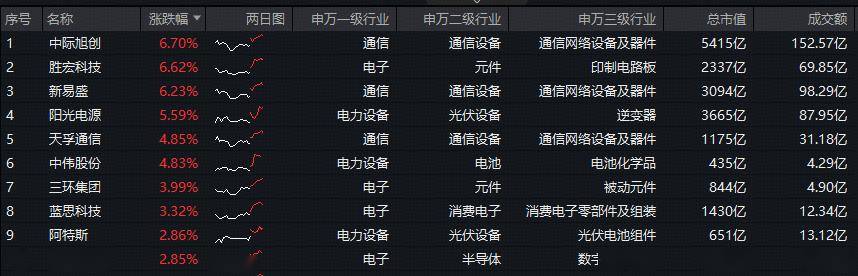 细分方向来看,光模块三巨头王者归来,中际旭创、新易盛涨超6%,天孚通信涨逾4%;PCB(印制电路板)方面,胜宏科技涨超6%;光伏方面,阳光电源涨超5%,阿特斯涨逾2%。