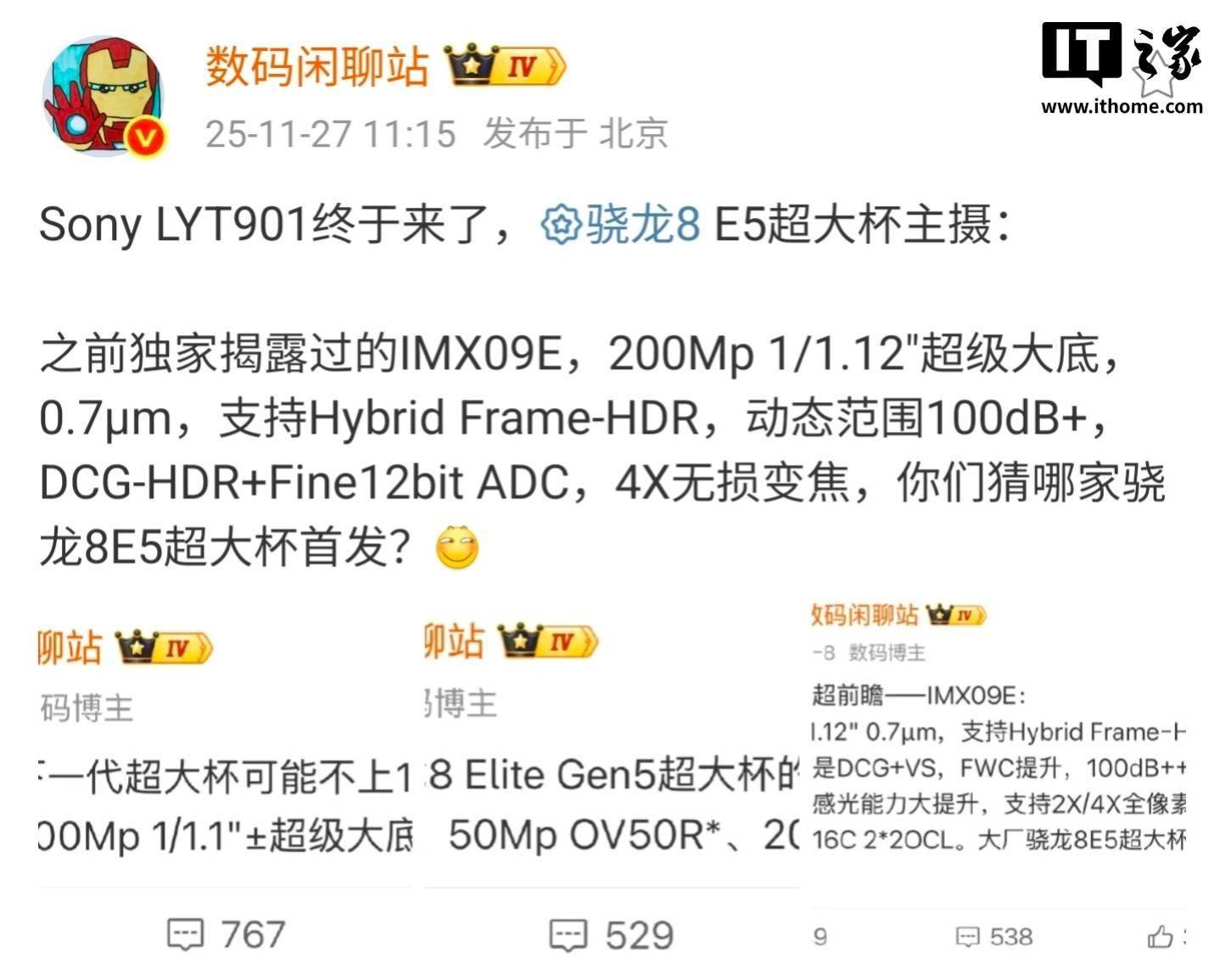 IT之家 11 月 27 日消息,博主 @数码闲聊站 今日曝光索尼 LYT901 图像传感器,将于第五代骁龙 8 至尊版“超大杯”主摄搭载。