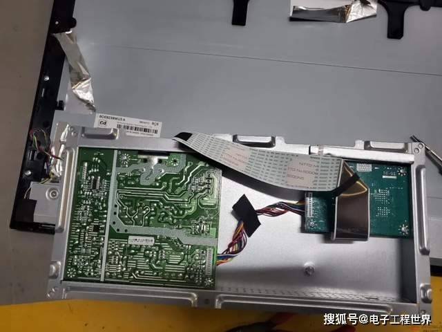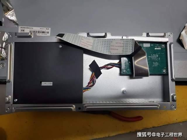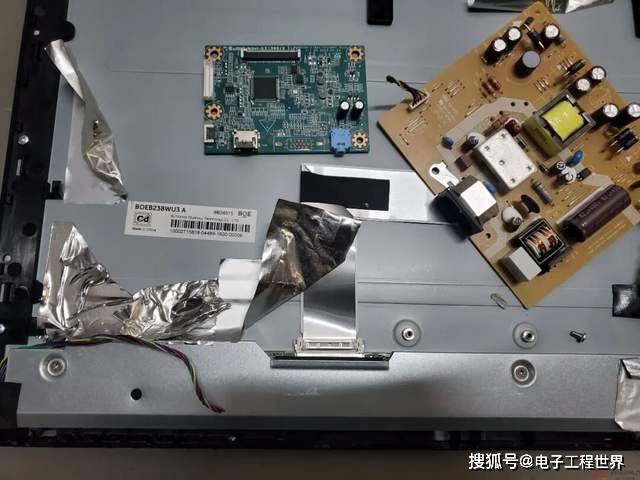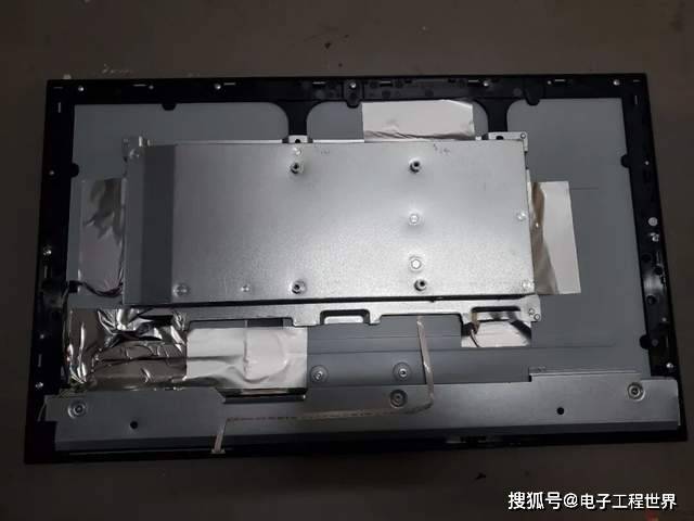 取下螺丝,可以看到,整个主板电源,还有显示驱动小板,都被铝合金材质包裹里面。底部小板的排线可以直接看到。还使用大量铝箔贴纸固定。