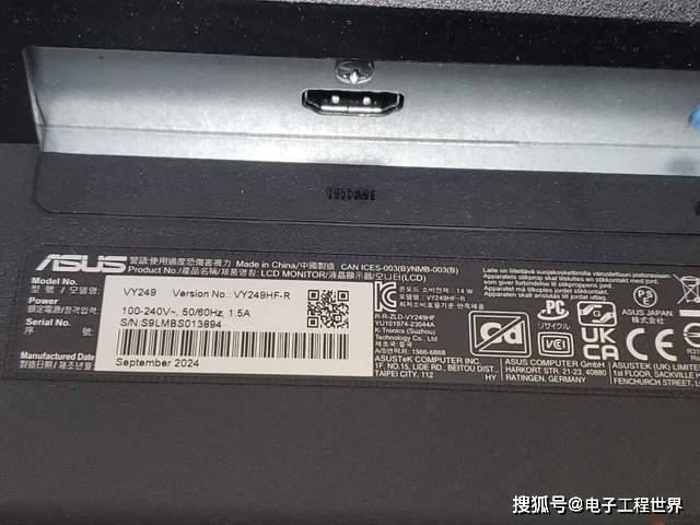 看标签信息,这是一台 ASUS VY249HF-R 23.8 英寸 Eye Care 游戏护眼屏,2024 年 9 月出厂,全球通用电压(100-240V)。